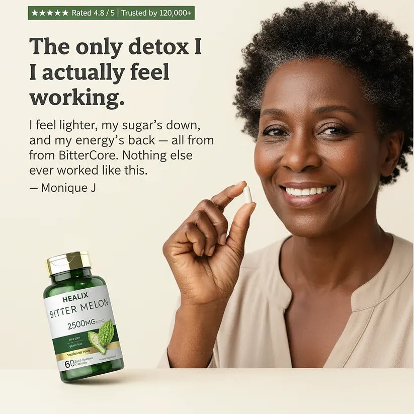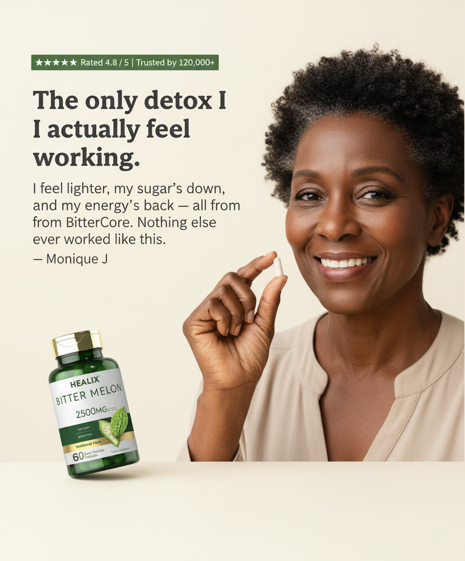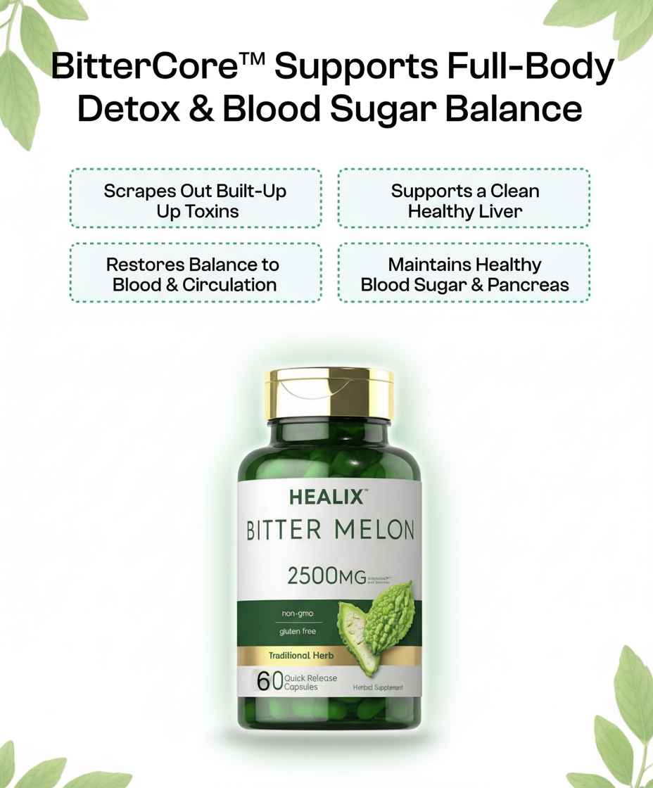 BitterCore™ is a full-body cleanse and metabolic support supplement made from 100% pure Bitter Melon (also known as Cerasee or Ejirin). It’s an ancient Caribbean and West African herb used for centuries to cleanse the liver, balance blood sugar, and flush out toxins. Each capsule contains a potent 2,500mg dose — with zero fillers, binders, or additives.